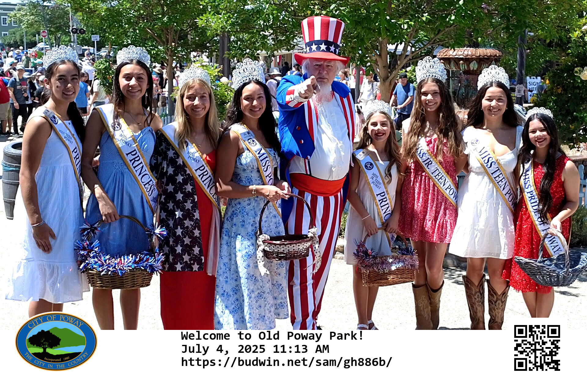 The image resolution is 300 dots per inch, so the picture dimensions are 1800x1200 pixels. The printable image includes the city seal, picture label ("Welcome to Old Poway Park") and the Q-R code that can be used to retrieve the picture from the Web.